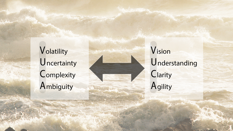 VUCA, ein Akronym, dessen Schlagworte als Zustandsbeschreibung der aktuellen Welt dienen sollen.
